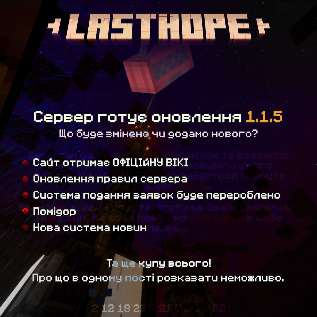 LastHope - це український Vanilla+- сервер, орієнтований на взаємодію гравців між собою. На цьому сервері ви не просто можете створити своє поселення ви зможете побудувати власну імперію! Ком’юніті на сервері доволі добре та позитивне, тому ви зможете завести багато друзів менш ніж за годину! Приєднуйся на сервер просто зараз!